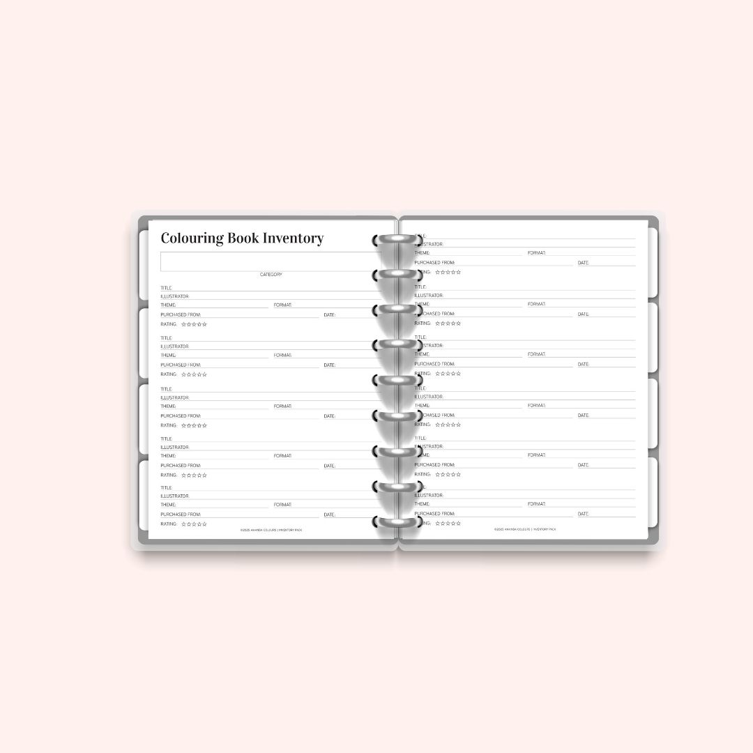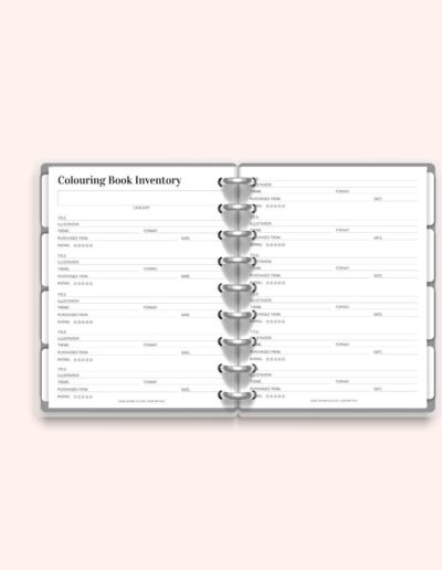 2 x Colouring Book Inventory Pages – log book titles, illustrators, format, theme, rating, and more